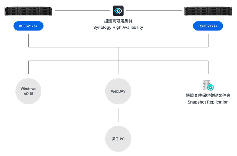 通过两台RS3621xs+组建高可用集群,采用Synology High Availability技术实现双机热备。当任一节点发生意外停机时,另一节点可在分钟级内自动接管所有业务,彻底消除单点故障风险。这种设计既保障了起重机、港口机械等重大装备研发数据的连续性,又确保了企业日常运营不受影响。