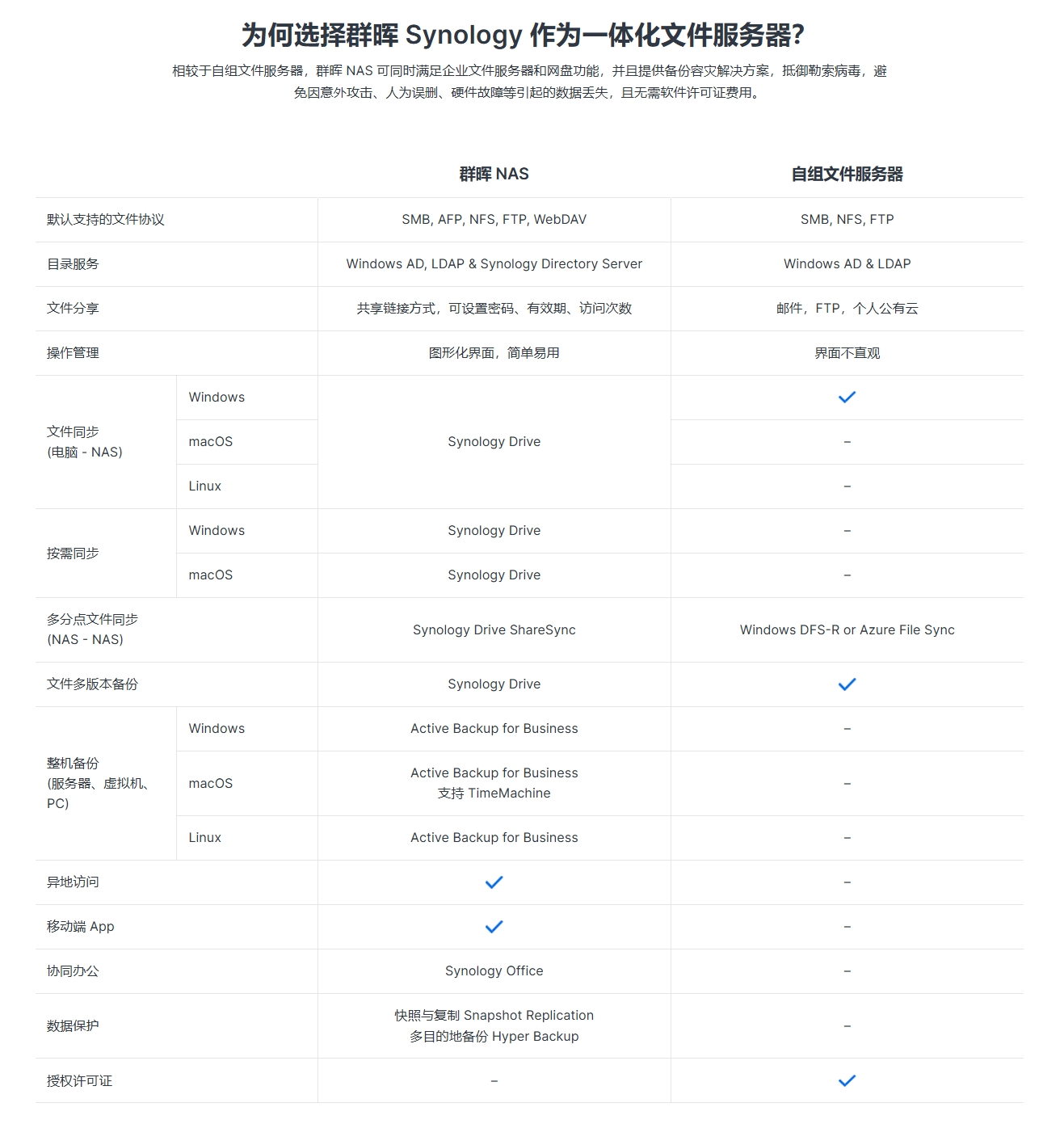 企业如何搭建文件服务器? 安全、易用、可异地存取是关键! 企业选择文件服务器受限于成本预算,通常会使用电脑主机或现有服务器自组搭建。但权限设置复杂、无法远程存取、功能单一、操作不直观等,降低管理效率。更重要的是,随着勒索病毒转向攻击企业,文件服务器存在中毒风险且缺乏灾备,一旦遭遇攻击可能导致数据丢失。 将老旧的文件服务器更换为群晖 Synology NAS,文件共享和管理更加便利,而且无需担心病毒威胁,提升工作效率和数据安全。
