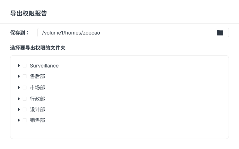 - 通过导出共享文件夹的权限报告,集中浏览帐户权限信息,便于进行权限的稽查审核。