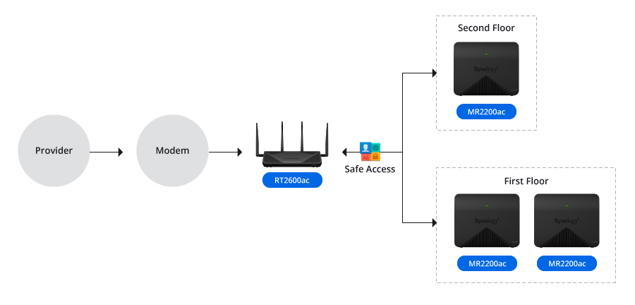 KiTA Tulpenstraße 决定创建 Mesh Wi-Fi 网络,其中使用 Synology RT2600ac 作为主路由器,并使用三台 MR2200ac Mesh 路由器作为卫星节点。得益于这三个卫星节点,整栋大楼都覆盖强大可靠的 Wi-Fi 信号,使所有设备无论在何处都可保持连接状态。使用基于 Mesh 的解决方案的优势是可通过单个 SSID 或网络名称访问整个网络。这意味着设备只需与网络配对一次,即可实现无缝漫游。整个网络使用 Synology Router Management (SRM) 进行集中化管理。