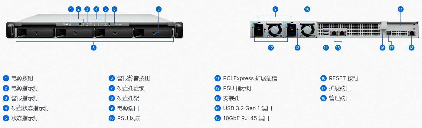 RS1626xs+ 采用 1U 机架式机箱,内置 4 个硬盘插槽,可使用扩充设备增加至 16 块硬盘,适合需要高性能计算和灵活扩展的企业工作负载,例如虚拟化存储、数据库应用和高效文件共享。