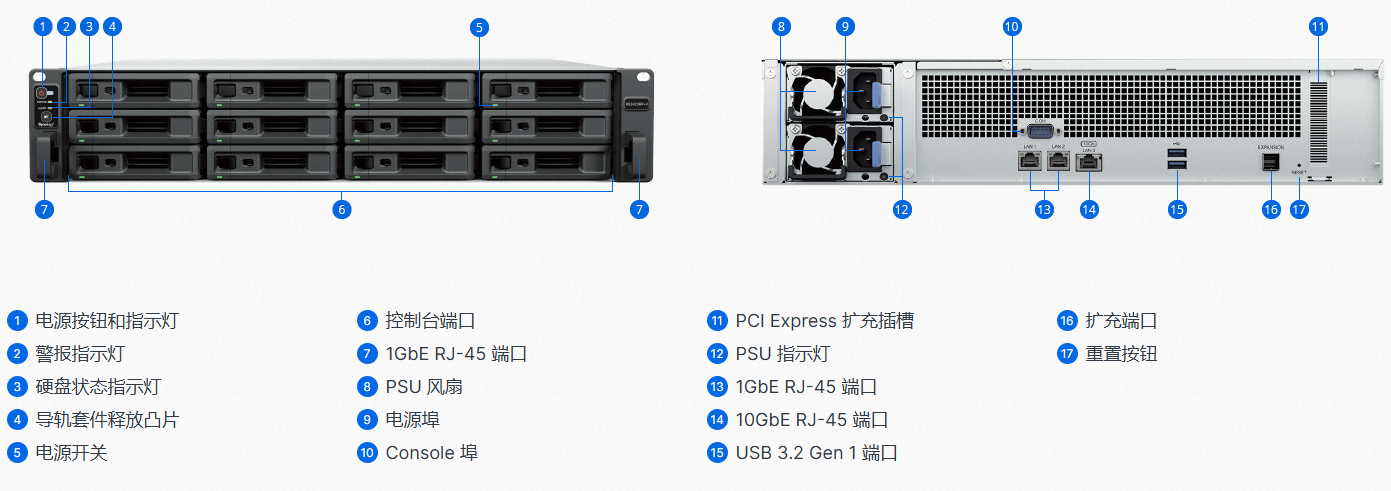 RS2423RP+II/RS2423+ 采用 2U 机架式机箱,内置 12 个硬盘插槽,可使用扩充设备增加至 24 块硬盘,适合需要高性能、可靠且经济高效的存储解决方案的中小企业和分支机构,用于文件管理、数据备份和监控。